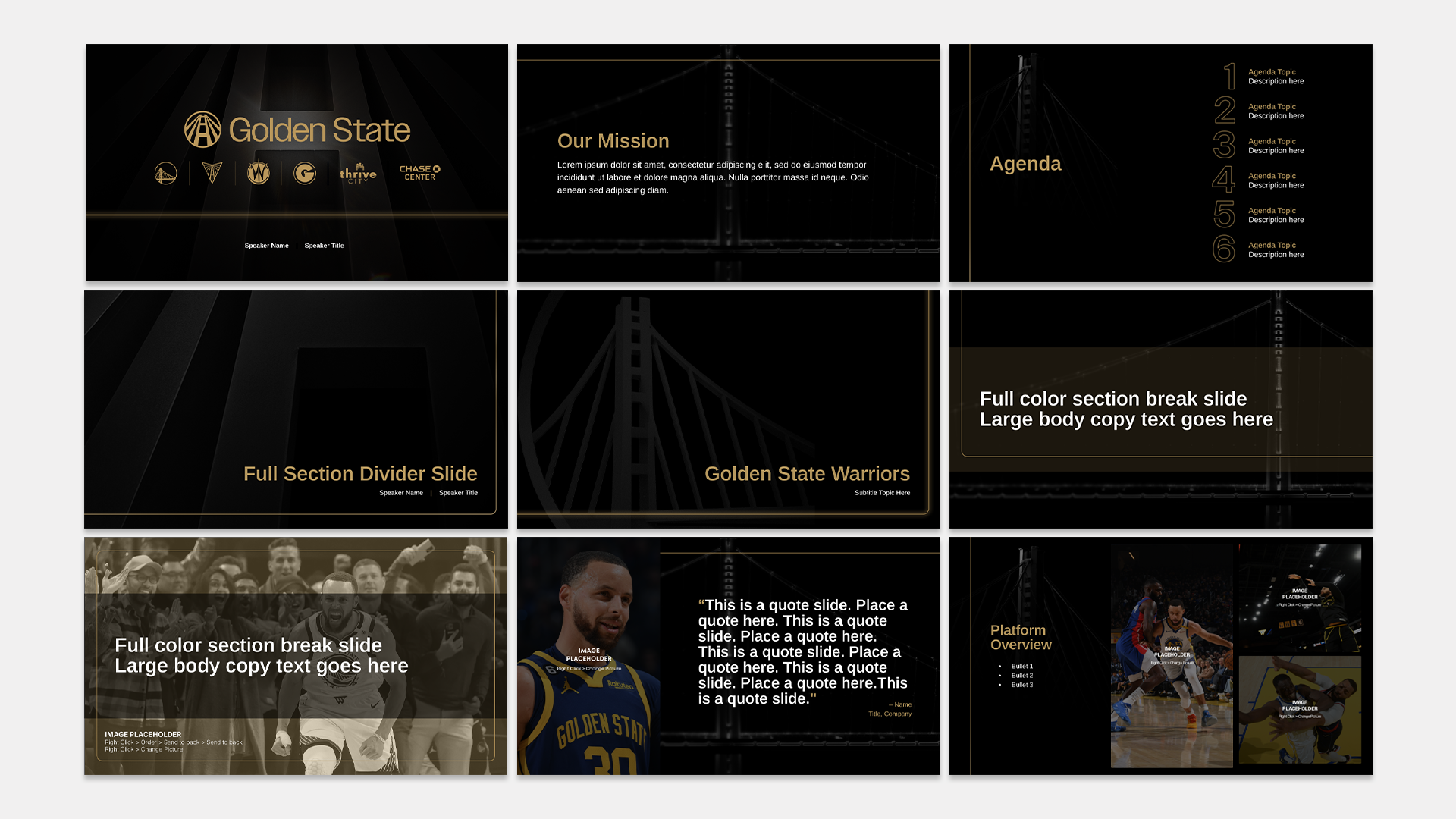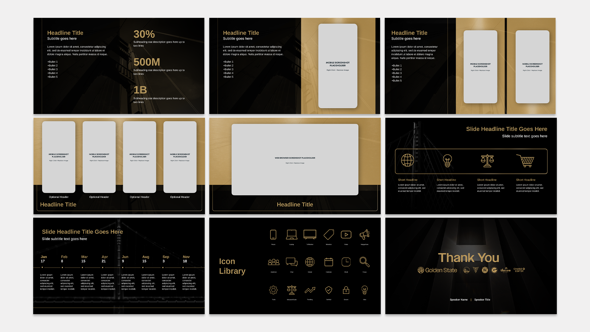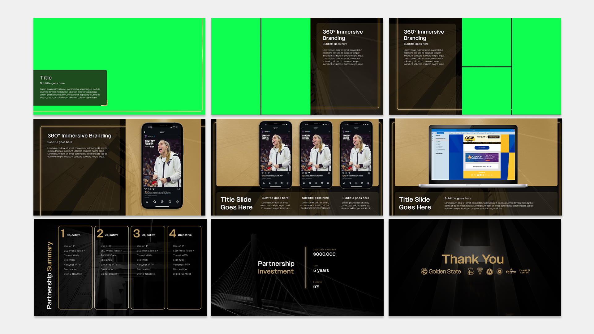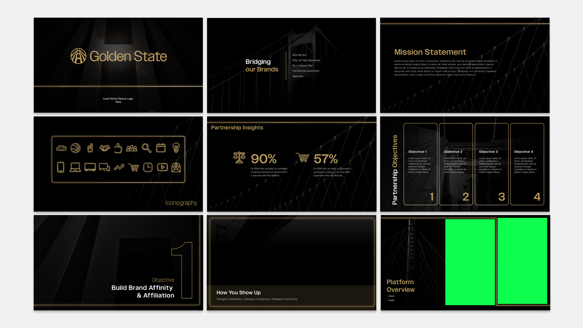 To build both templates I used Golden State brand colors, themes, concepts in various ways throughout the proposal design. Integrated throughout the design is our Golden State gold, the unifying element across all properties as well as the Bay Bridge. Gold accents and lines throughout the deck emphasize our sophisticated and valuable quality while connecting back to the bridge and cable lines visuals. Key differences between the templates, such as when the full Golden State logo is used, rely on the end user and their familiarity with Golden State Group and its individual properties.