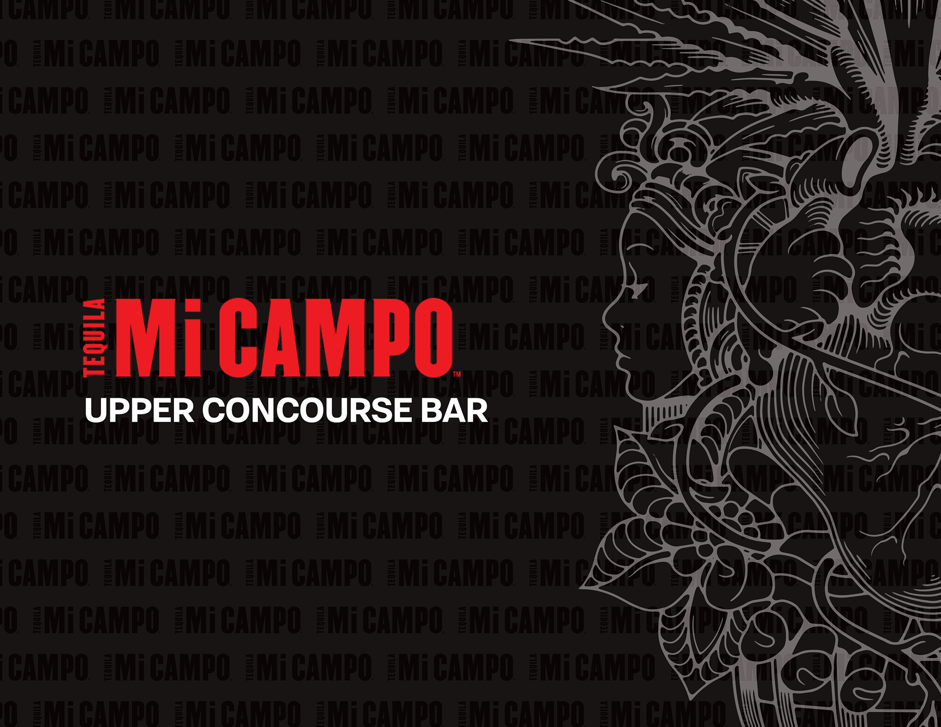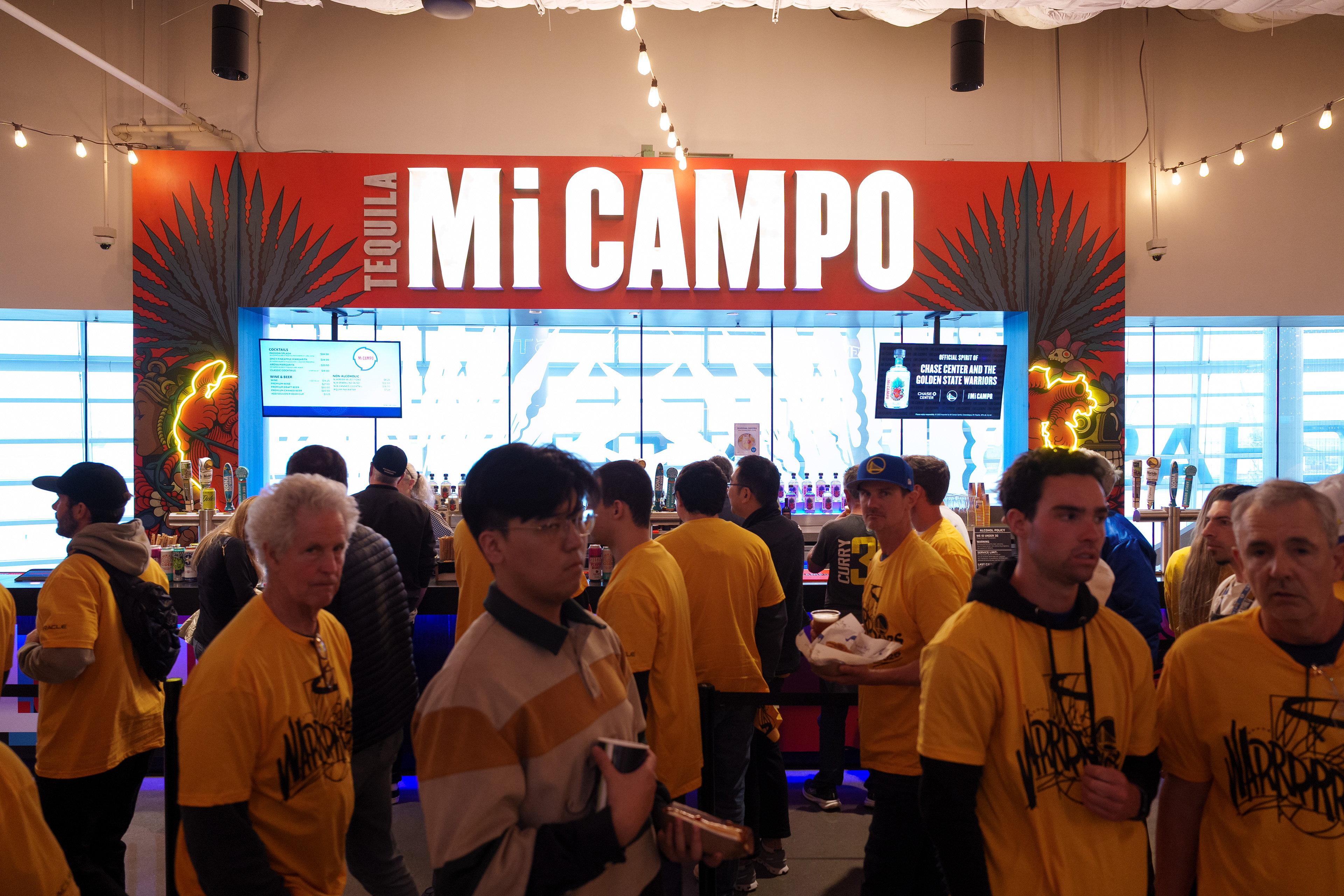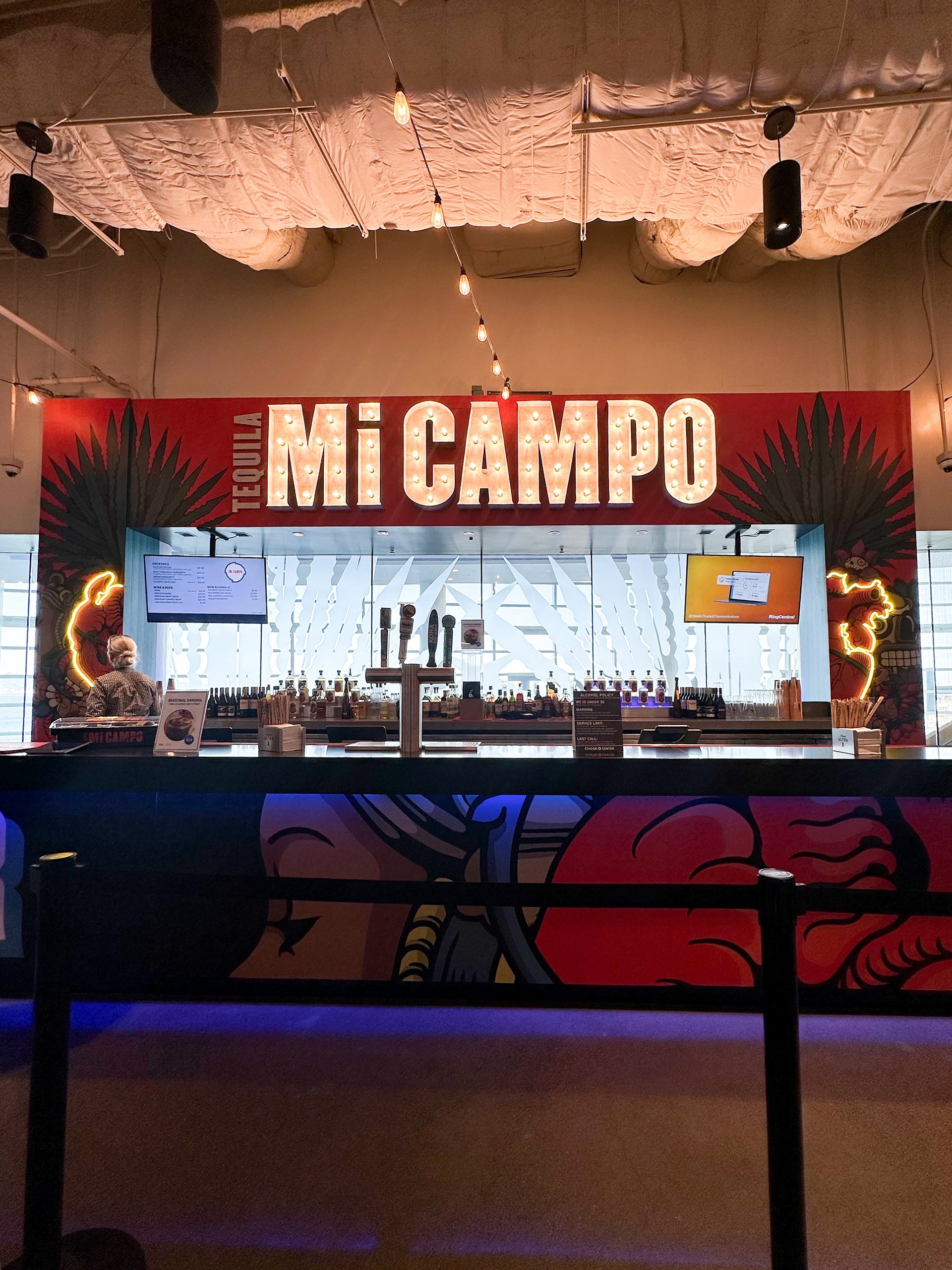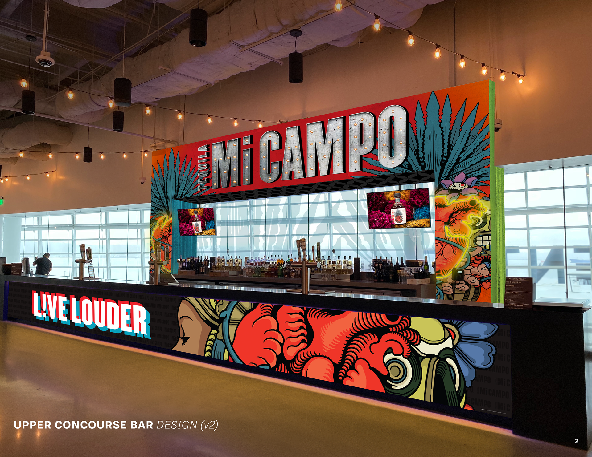Brand the Chase Center Upper Concourse bar using Mi Campo Tequila's visual identity that strays away from the traditional tequila branding.